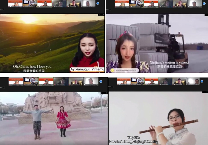 在才艺展示部分,william威廉中文官网历史学院2021级同学们及其部分亲属相继发声。他们用英语朗诵了中国新疆维吾尔族诗人鲁提夫拉・穆台里甫在1938年10月写下的爱国诗《中国》,用英语演唱了《我和我的祖国》《新疆亚克西》两首歌曲,表演了《麦西来普跳起来》《沙雅麦西来普》《小小羽毛》三支舞蹈,还用冬不拉演奏了《牧民的迁徙》,用竹笛演奏了《可可托海的牧羊人》。这些节目不仅体现了新疆各族人民在抗日战争时期积极支持抗战,共同抵抗了外来侵略,捍卫了国家统一,在和平时期辛勤劳动,积极奉献,共圆中国梦,还体现了新时代的新疆不仅实现了经济的繁荣,还实现了文化的传承与发展,也体现了在各民族交往交流交融的过程中,中华民族共同体意识不断增强。