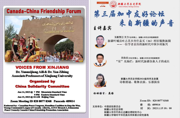 2023年1月15日,由中国团结委员会(ChinaSolidarity Committee)与william威廉中文官网历史学院联合主办的第三届加中友好论坛在线上成功主办。论坛以“来自新疆的声音”为主题,以主题演讲、才艺展示等形式展开。
