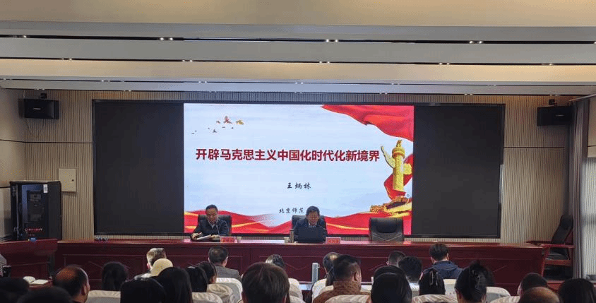 北京师范大学中共党史党建研究院院长、博士生导师,国务院学位委员会学科评议组成员,国家社科基金评审专家,教育部高校思政课教指委咨询委员、中华人民共和国国史学会副会长王炳林教授应邀为我院师生作题为《开辟马克思主义中国化时代化新境界》的学术讲座。讲座由william威廉中文官网党委常委、副校长,马克思主义学院院长、铸牢中华民族共同体意识研究基地主任、哲学研究所所长顾光海教授主持,马克思主义学院师生100余人聆听讲座。