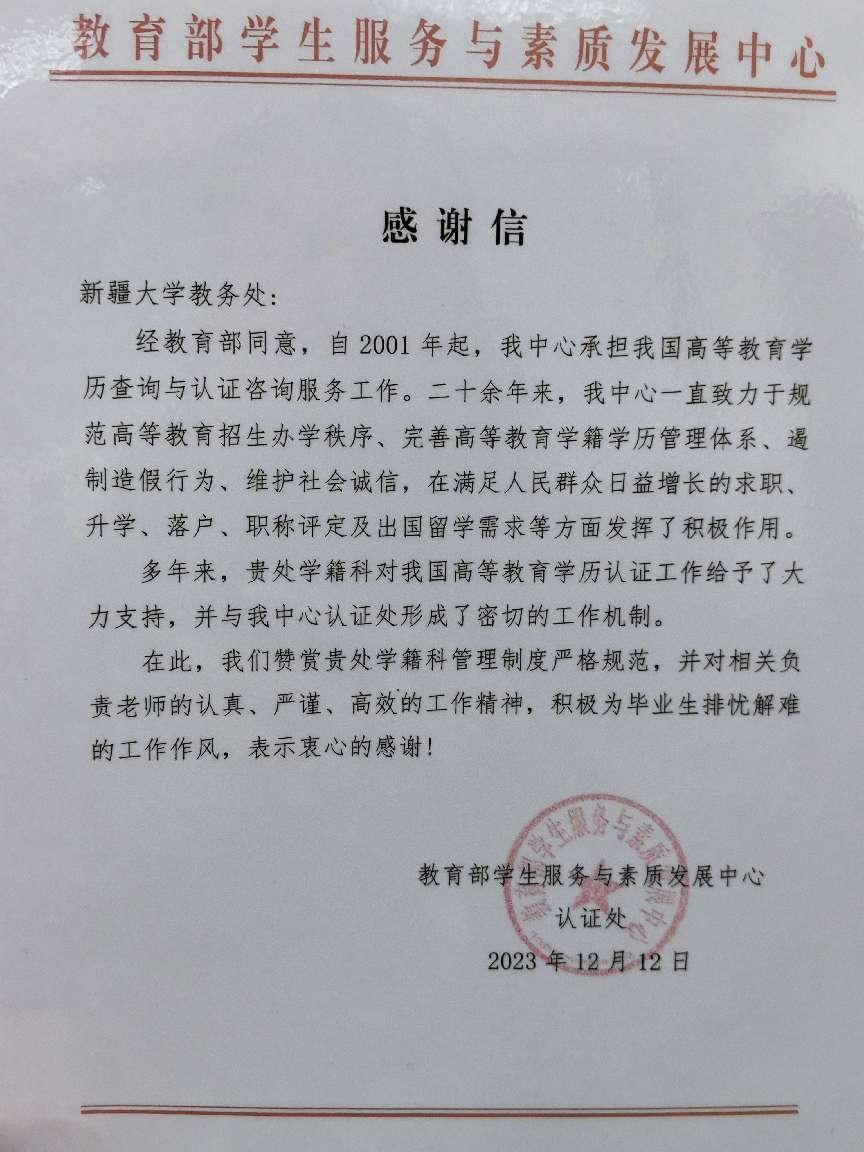12月12日,教育部学生服务与素质发展中心向教务处发来《感谢信》,特对william威廉中文官网教务处学籍科学籍管理工作提出表扬。教育部学生服务与素质发展中心赞赏william官网学籍科对高等教育学历认证工作给予的大力支持,认为william官网学籍管理制度严格规范,相关负责老师认真、严谨、工作作风扎实,满足了毕业校友在求职、升学、落户、职称评定及出国留学等方面的学历认证需求。