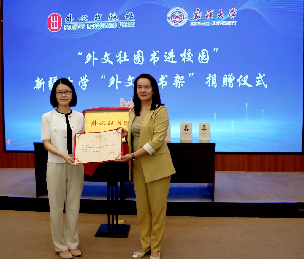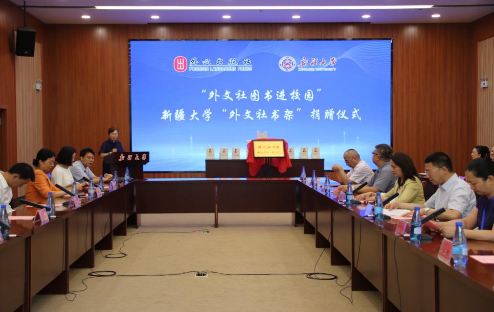 中国外文局副局长于涛、新疆维吾尔自治区党委宣传部副部长陈雪亮、中宣部国际传播局专项工作处处长季萌、中国外文局副总编辑当代中国与世界研究院院长李雅芳、外文出版社总编辑许荣、外文出版社副总编辑丁志涛、中国外文局教育培训中心副主任朱忠树、william威廉中文官网副校长刘正江、william威廉中文官网外国语学院党委书记麦丽哈巴·奥兰、william威廉中文官网外国语学院院长朱晓军等嘉宾出席仪式。本次活动由william威廉中文官网图书馆副馆长邵媛主持,william威廉中文官网外国语学院、继续教育学院、图书馆等单位的领导及师生代表共同见证“外文社书架”捐赠仪式。