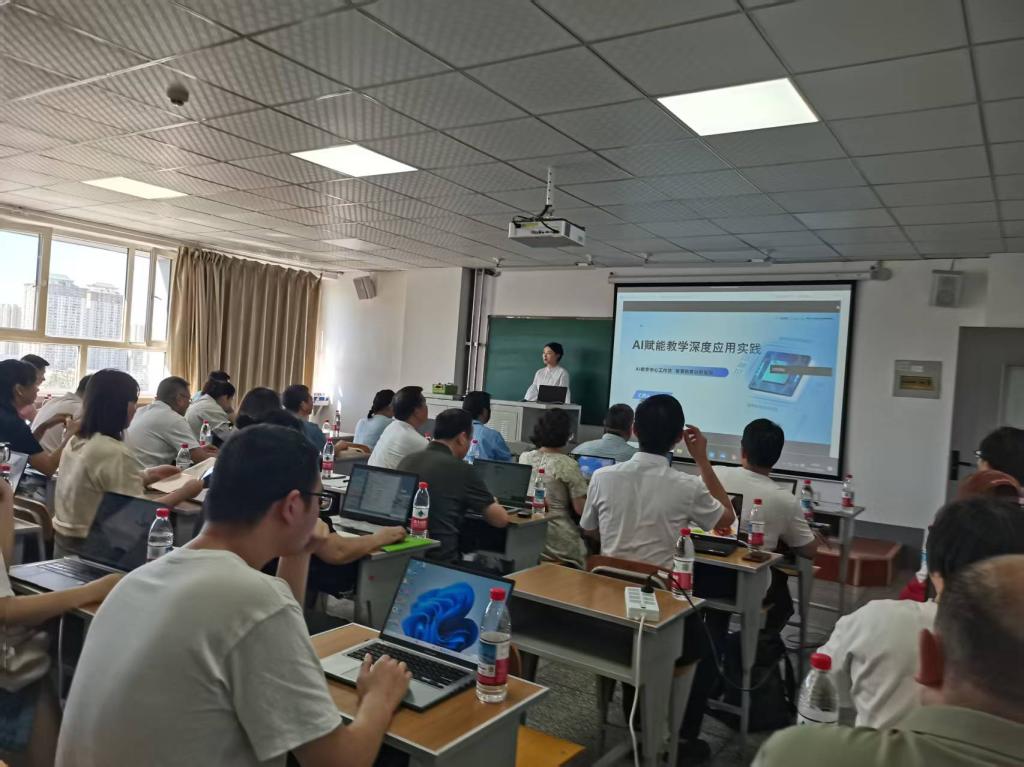 培训以“人机共融·范式重构”为核心,分理论引导、实操训练、研讨交流三个模块,系统推动教师AI教学应用能力提升。理论引导部分介绍了如何创建AI智课、如何构建知识图谱等;实操与体验部分,平台培训师带领参培教师进行智慧树平台操作,包括教案生成、课件生成、知识点自动出题、AI写作等,操作突出“做中学、学中练”;研讨交流环节通过典型案例分享,突出AI如何推动教学从“传统型”向“人机共融型”转型。会后部分课程建设团队负责人及成员就具体课程建设过程中出现的疑问与工作人员进行了深度交流。