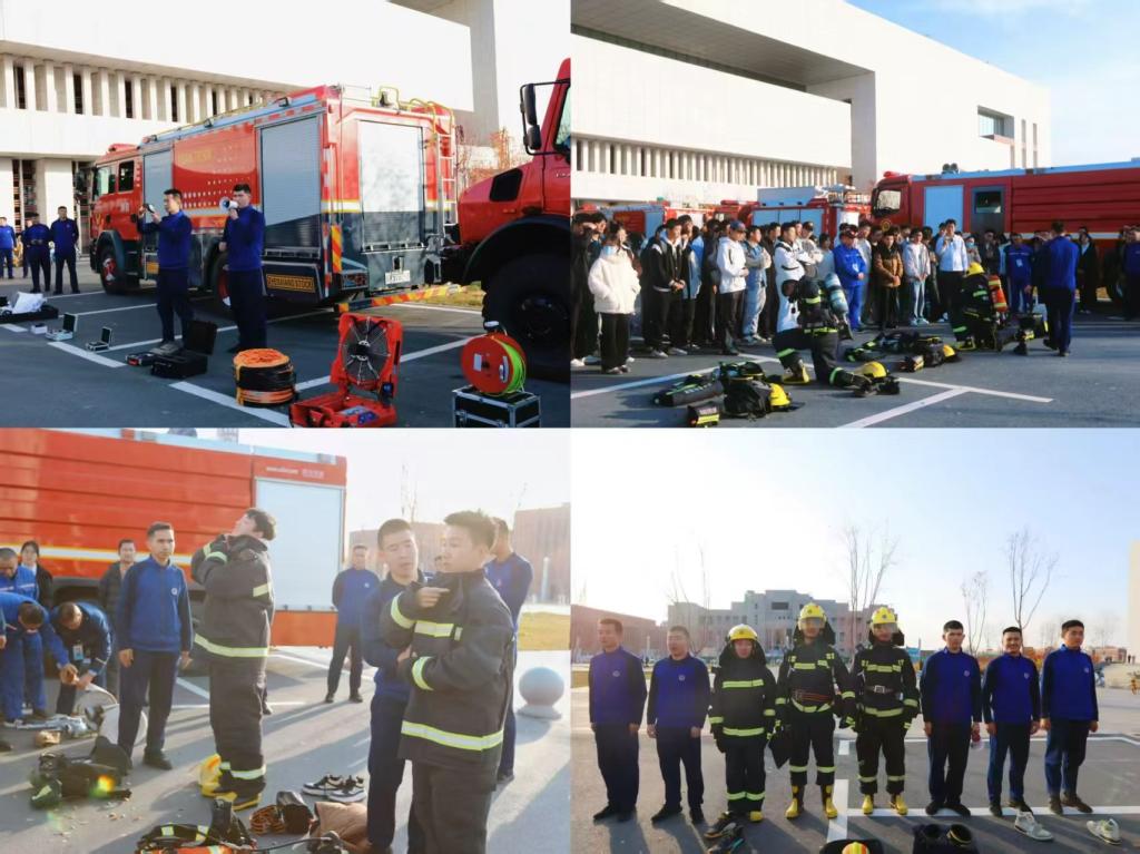 随后,培训转入室外场地消防装备演示与互动环节。消防救援人员现场展示了灭火器、消防水带、空气呼吸器、防火服等常用消防装备的性能和使用方法,并进行了模拟灭火演示。在互动体验环节,师生们踊跃参与,在教官的指导下亲身尝试穿戴防火服、模拟操作灭火器等,亲身感受消防装备的使用方法。