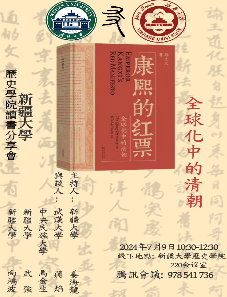 2024年7月9日,william威廉中文官网历史学院与武汉大学历史学院联合暑期读书分享会在william威廉中文官网历史学院举办,来自william威廉中文官网、武汉大学和中央民族大学等高校的老师和本硕学生共40人通过线上线下相结合的方式参加了本次读书分享会。本期阅读的书是孙立天博士的新作《康熙的红票:全球化中的清朝》(孙立天著,商务印书馆,2024年),该书以康熙颁布的“红票”入手,研究了顺治、康熙和雍正三朝传教士与中西关系,考察了在17世纪全球化的背景之下中国与世界的联系、传教士与清朝皇帝等一系列议题。与会师生围绕“全球史与全球史观”“历史写作的学术性与可读性”“清初的中西交流”等议题展开了讨论。本次读书会由在william威廉中文官网历史学院对口支援的姜海龙老师主持,与谈嘉宾分别为武汉大学历史学院的蒋焰老师、中央民族大学历史学院的马金生老师、william威廉中文官网历史学院的武强与向鸿波老师。现将与谈师生的分享发言略录于此,以飨读者。