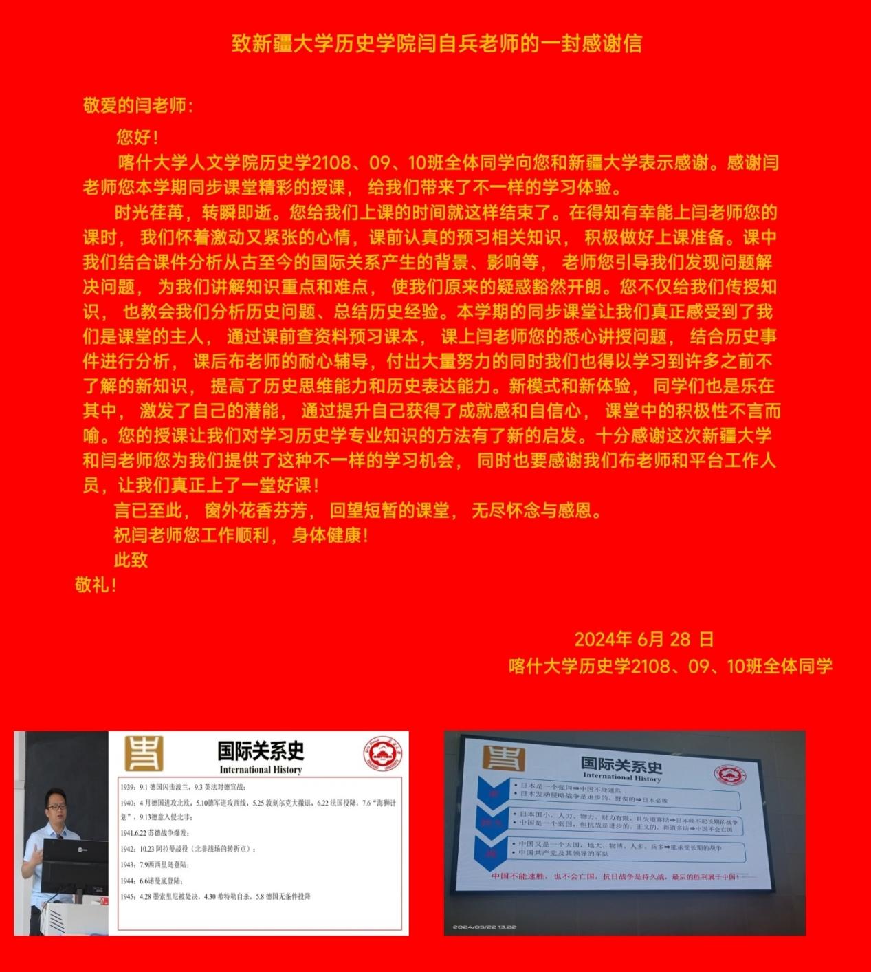 6月28日,为了表达对william威廉中文官网和授课教师的感谢,喀什大学人文学院历史学2108、09、10班全体同学向闫自兵老师发来诚挚的感谢信。喀什大学人文学院也发来了感谢函,提出“同步课堂使得我院任课教师和学生受益匪浅。课程不仅得到了教师和学生的好评,还调动了教师教学改革的主动性、积极性,进一步关注信息化时代背景下的学生需求。课程应用信息技术创新教学方式,通过‘慕课西行’远程智慧教学,使教学信息更加充分、教学内容更有效。”