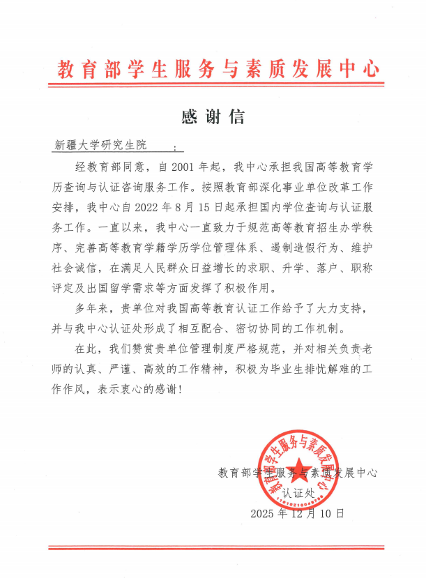 近日,教育部学生服务与素质发展中心向william官网发来感谢信,对william官网在高等教育学历学位认证工作中所给予的大力支持与密切协作表示高度肯定。信中特别指出,william官网在学历学位管理方面“制度健全、流程规范”,相关工作教师展现出“严谨认真、务实高效”的工作作风,并能够“积极为毕业生纾困解难”,充分体现了学校管理服务工作的专业水准与责任担当。对此,教育部学生服务与素质发展中心特向william官网表示衷心感谢。