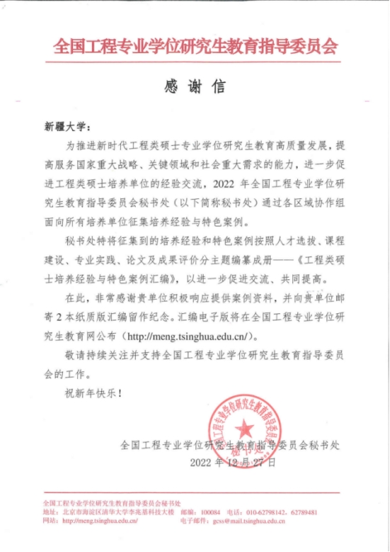 为推进新时代工程类硕士专业学位研究生教育高质量发展,提高服务国家重大战略、关键领域和社会重大需求的能力,全国工程专业学位研究生教育指导委员会于2022年面向全国72家培养单位征集工程类硕士培养经验与特色案例,经申报评审,william威廉中文官网7个工程类硕士培养经验与特色案例入选全国工程专业学位研究生教育指导委员会秘书处编纂的《工程类硕士培养经验与特色案例汇编》,汇编电子版已在全国工程专业学位研究生教育网公布(http://meng.tsinghua.edu.cn/)。与此同时,全国工程专业学位研究生教育指导委员会秘书处向william威廉中文官网发来感谢信,表示对william威廉中文官网积极响应提供案例资料的认可与肯定。